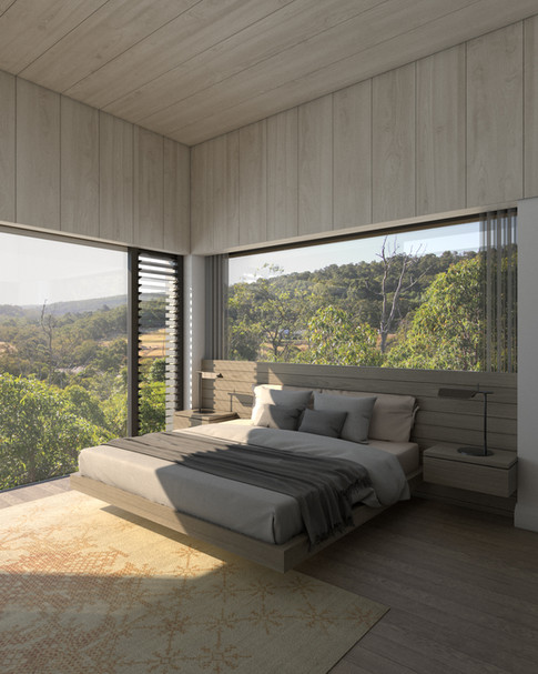 This house is for a family with two young children. Located in the Perth Hills suburb of Roleystone on a five acre bush block, it commands stunning viewsdown the Canning River Valley. We decided what little flat land existed was best utilised as outdoor space for children's games. The house could make it's own flat platform on steel poles, the land falling away beneath. Long windows span the eastern side of the house taking in the expansive views. External blinds sit in a hidden pocket above, dropping to shield the summer sunrises down the valley.