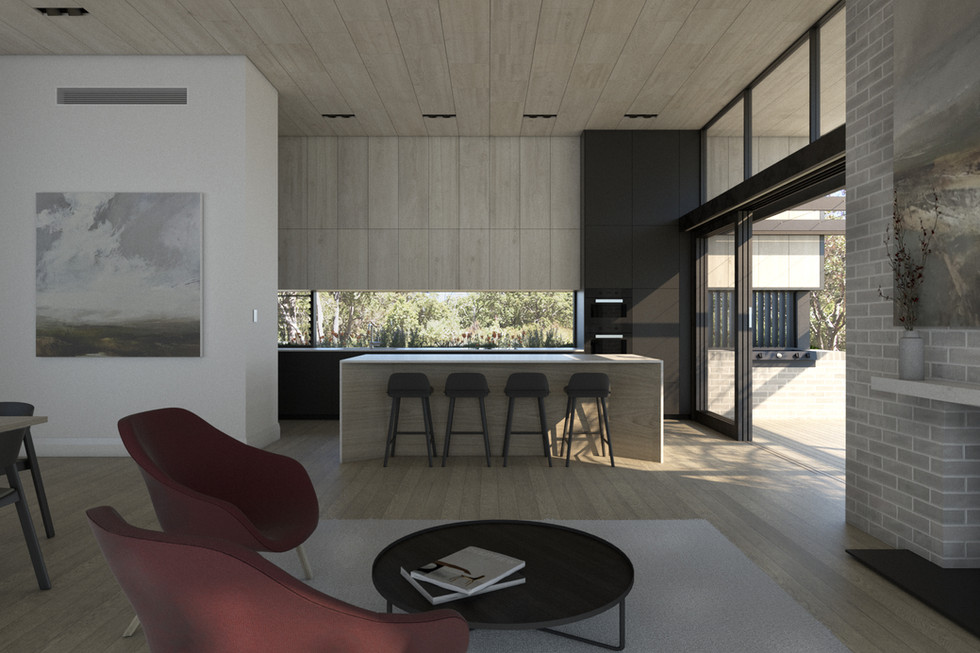 The kitchen and living spaces are to the north, adjacent the garden. These combined spaces will form the hub of family life. It is important that they be visually connected and close, yet spacious enough accommodate family and friends in comfort. The large block meant that rooms could be arranged to take in views from all sides. With no need for two storey construction, high ceilings are possible, stepping for high level windows to add to the abundant natural light. The use of steel and timber framing allowed us to leave the hill side relatively undisturbed. These materials have been carried through internally and combined with face brick elements to provide a sense of solidity and permanence, anchoring the house to the ground.